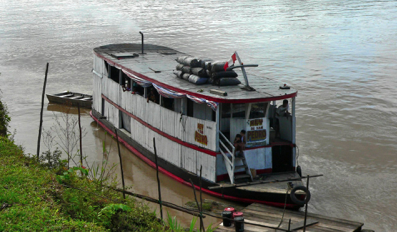 After lunch we got back on the small boat and cruised to a village and a school. The village had about 300 people in family homes, built on stilts, with wooden half walls, wooden floors, a palm leaf roof with wide overhang to keep out rain and sun, and very little furniture. Cooking is done over open fire and the food is primarily locally grown vegetables and fruits, home grown or hunted meat (chicken, duck, turtle, goat, cow, water buffalo, or wild animals). There are no beds; people sleep on the wooden floors. There is no electricity except from generators which some families have. We saw several antique pedal run Singer sewing machines much like the one I learned to sew on when I was a kid on the farm. Travel to Iquitos is 22 hours by boat (pictured at the top) and passengers must provide their own food and hammocks. The school was closed due to the time of day – the heat of the afternoon, but the children gathered to sing some songs for us. Lovely and polite children but very energetic out of doors. They saw us off at our impromptu boat dock. The people here use the Amazon river as a source of drinking water. They also bathe in the river and do their laundry in the river. People and animals live in close proximity.