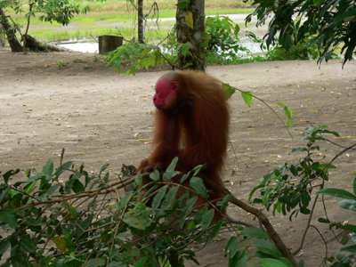 Up at 6:15, breakfast at 7:30, then an open boat ride of about 25 minutes to Monkey Island. After we climbed some really steep steps up the bank from the landing spot, we had a 20 minute walk through the jungle to a “ranch” that rescues infant and injured monkeys with the goal of releasing them back into the wild. There were a lot of different kinds of monkeys but most were way too playful for us to be really comfortable. One particular monkey with really mangy looking fur was downright aggressive. I put on my long sleeved overblouse as a defensive measure to cover my backpack and my arms. The nasty monkey grabbed my folded walking stick but I got aggressive and shook him off. A small howler monkey scampered up the walking stick and arm of one of the men, curled around his neck, and stayed there throughout the visit. It finally had to be removed by one of the natives.