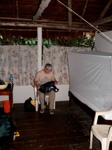 Lunch was in a screened in dining room – beef/water buffalo stew, rice, beans, slaw, and bread. The stew was nicely seasoned and quite good. Purified water for drinking and tooth brushing was available in the dining room and near the sleeping quarters. There was a bar with cold drinks. They have a small generator for the kitchen and the cooler for the bar, and, sometimes for the ceiling fans. Lighting after dark was provided by kerosene lamps. It is really hard to read by kerosene lamplight.