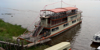 The flight to Iquitos left at 5:45 and arrived in Iquitos at 7:30. Our guide, Raul, met the flight and led us with our luggage on a short stroll to the bus for a 30 minute ride to the boat dock. The bus was 35 years old and had no windows. I was grateful for my goggle style sunglasses to keep the dust out of my eyes. The boat was named the “Amazon Queen”. We chose to sit on benches on the top deck for a better view and for the breeze. We cruised up the river for two hours and then transferred onto a smaller boat for another 25 minute ride. The small boat ride was fast and a bit rough.