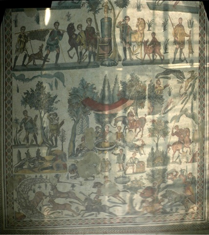 The mosaics at the site of a Roman villa provided a contrast to those that we saw in the Norman cathedrals in Monreale and Cefalu. The colors of the profane figures are subdued in comparison to the sacred images in the church.