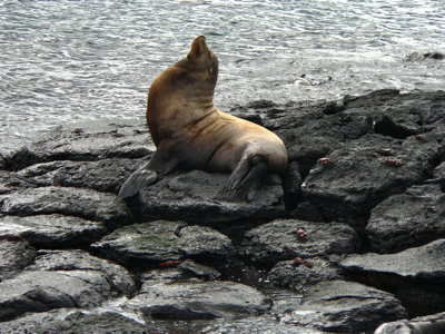 I woke up a little queasy from the boat motion. I decided to try a ginger capsule and it either worked like magic or I had a sudden spontaneous recovery. We got up at 6, had breakfast at 7 and departed on the small boats at 8. It was a dry landing on south Plaza Island. As we approached we could see lots of sea lions in the water and on the rocks and the beach. The landing was directly onto some steep steps from which went along a narrow wall top to the actual land. It is barren desert landscape covered in large patches of carpet weed. The carpet weed changes from green to yellow to red as it matures. Most of what we saw was red. There were also lots of large cacti – some with tree-like trunks. The tough trunks help protect the plants from being eaten by the iguanas. We saw many birds including blue-footed boobies, swallow-tail gulls, frigate birds, mockingbirds, Galapagos fly-catchers, and yellow warblers. We walked along the cliffs and watched sea birds hunting for food and swooping and playing in the thermals. We went back to the boat about 11 and had lunch at noon followed by a couple of hours to read or just watch the landscape.