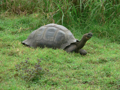We got up at 5:30 and packed everything. We were ready for breakfast at 7 and on the zodiacs with our luggage for a 30 minute ride to shore on the Island of Santa Cruz. Next, we got on a bus, making sure our luggage was on the same bus, for another 30 minute ride to a caldera site from old volcanoes. We walked along the edge of one large caldera. I was nervous. We were too close to the edge for my comfort, especially since my inner ear had not recovered from several days of boat motion and I felt like I was moving side to side even when I was physically standing still. From the caldera we rode the bus for another 30-40 minutes to an old farm inhabited by giant tortoises. We saw dozens of them munching grass, sitting still, or walking on to the next grassy area. This is their natural habitat and some of them are very old and very big. We got more great photos. There was a brief restroom stop and time for a cup of organic coffee or lemongrass tea. From there it was back on the bus for the rest of the ride into town. We checked into the Silberstein Hotel. We have a large, pleasant room with air conditioning, a nice shower, soft beds, washcloths, and a swimming pool.