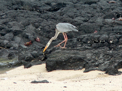 We went back to the day boat after that adventure for another 30-40 minute cruise. We had lunch on board – fish, rice, veggies and Coke. The next activity was a wet landing on a sandy beach back on Santa Cruz Island and another hike across sand and rock. We saw a great blue heron and some crabs. The feature of this beach (called barge beach) was the iron remains of US barges from World War II. All that is left that you can see is some iron poles(maybe a few inches high) sticking out of the sand.